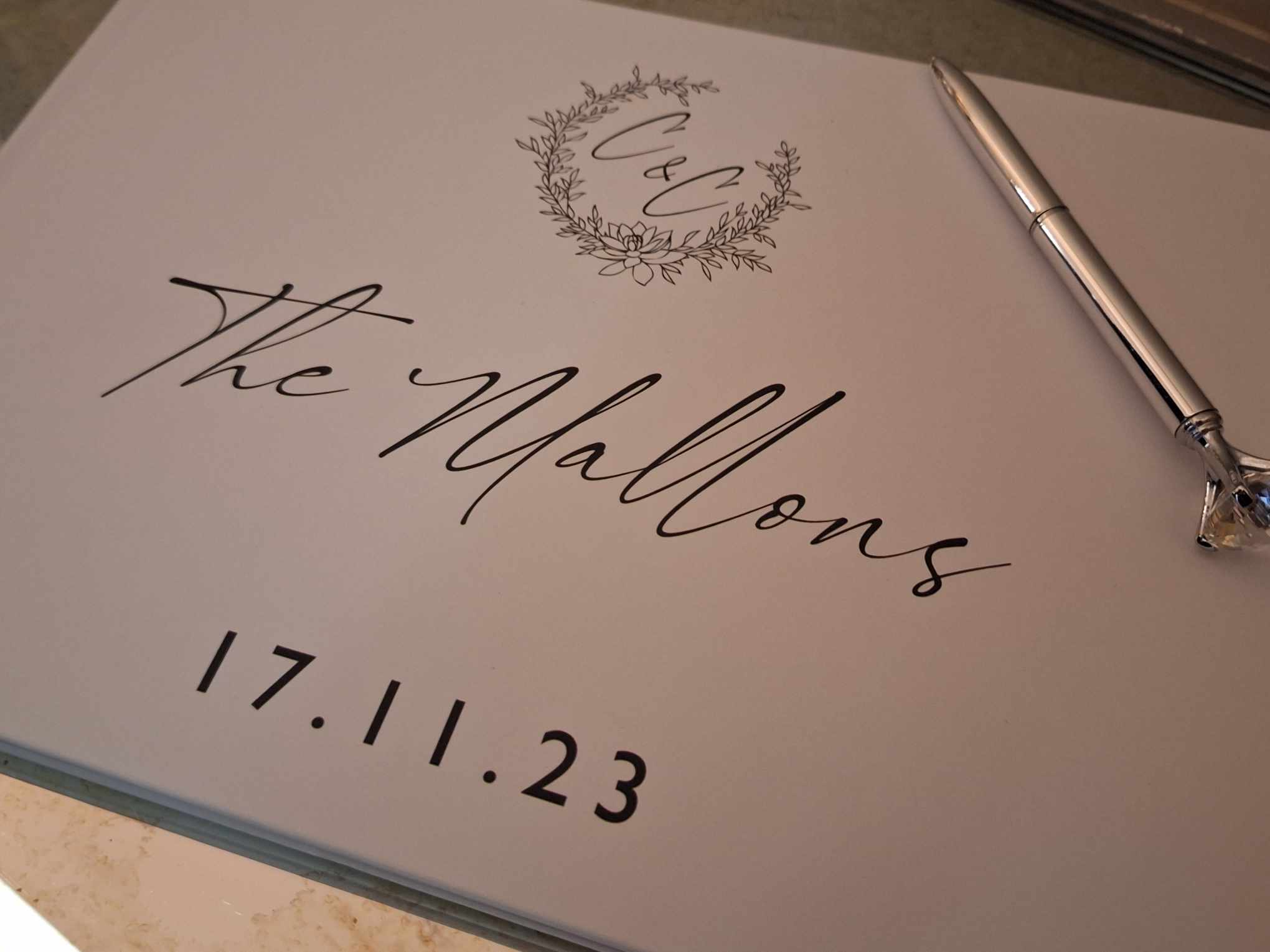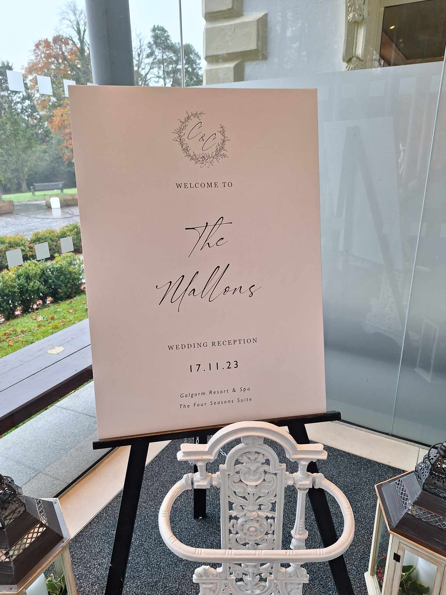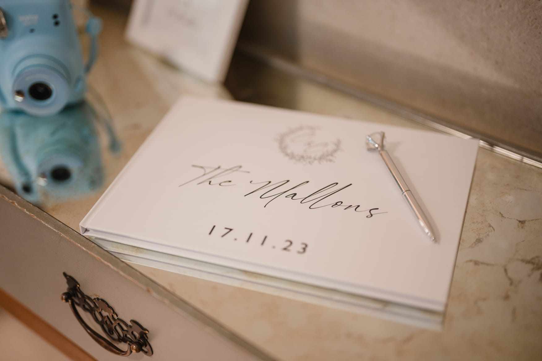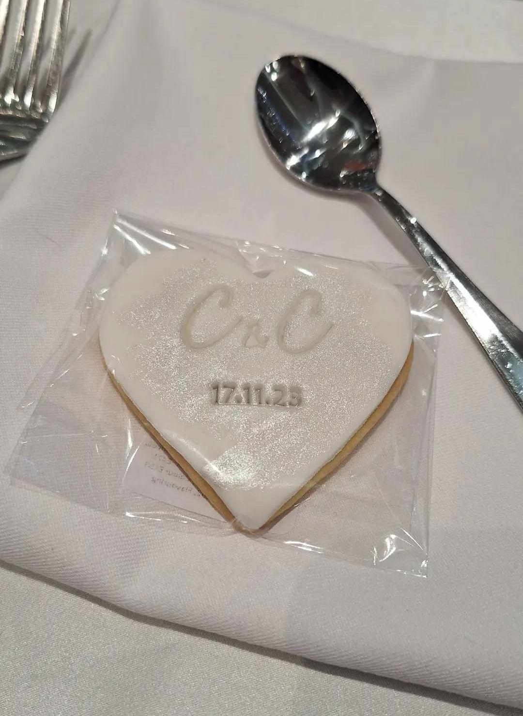 Below, you will see images of; the guestbook cover, two large signs on easels that were on display at the ceremony / reception, the ceremony programme, the invites (details blurred) , the table sign markers and the custom made cookies.