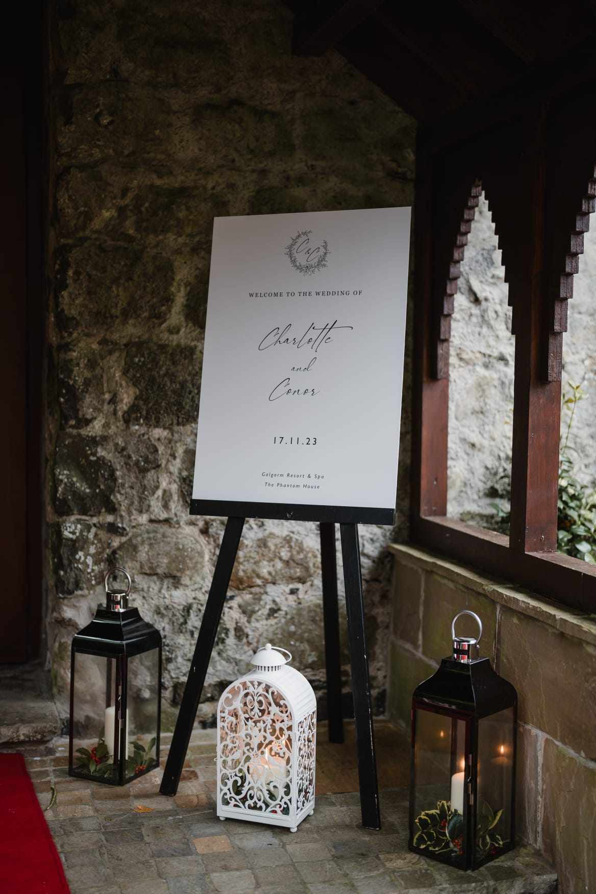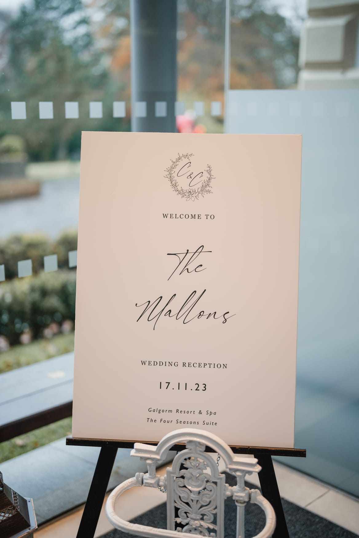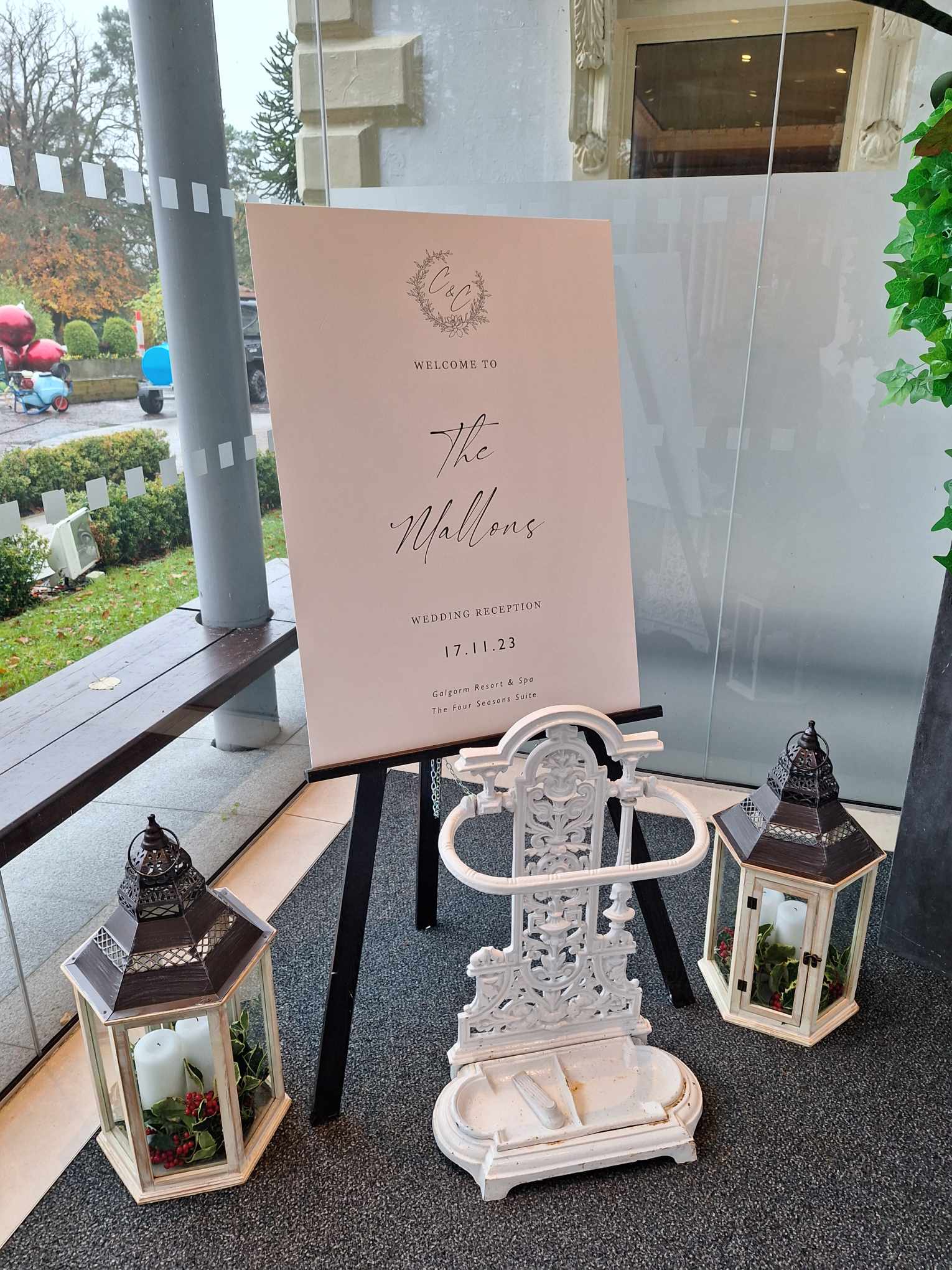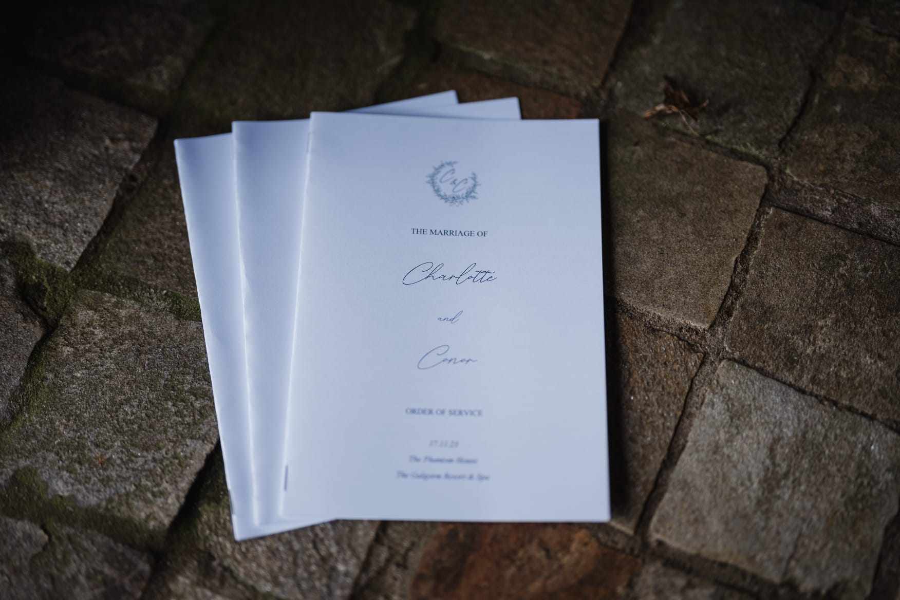 Below, you will see images of; the guestbook cover, two large signs on easels that were on display at the ceremony / reception, the ceremony programme, the invites (details blurred) , the table sign markers and the custom made cookies.