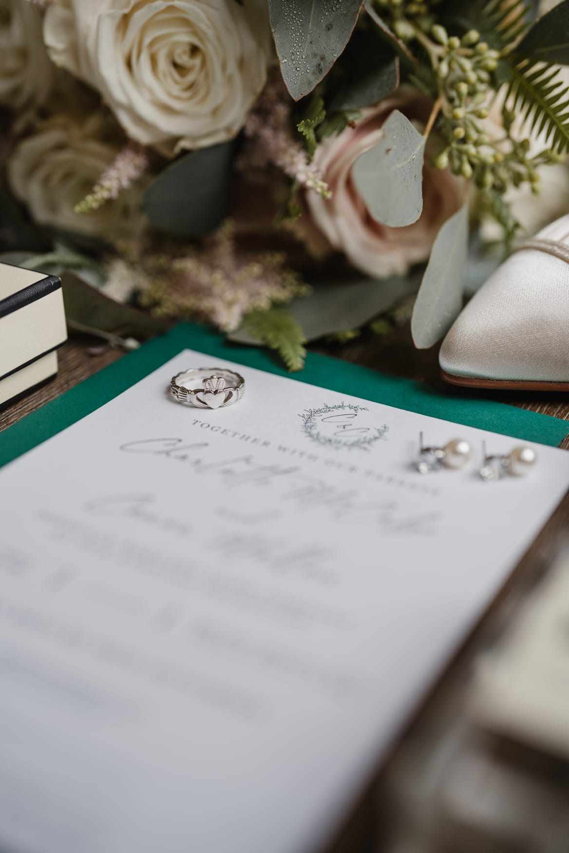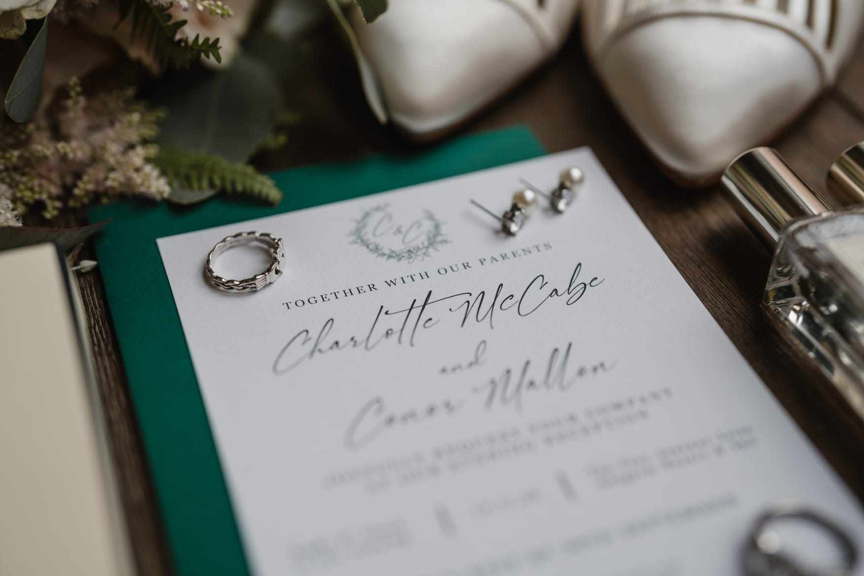 The colour selected was a deep green, so I worked with that colour, the selected font and then added the rounded laurel and two separate sans serif fonts for the main body copy of the invites and posters.